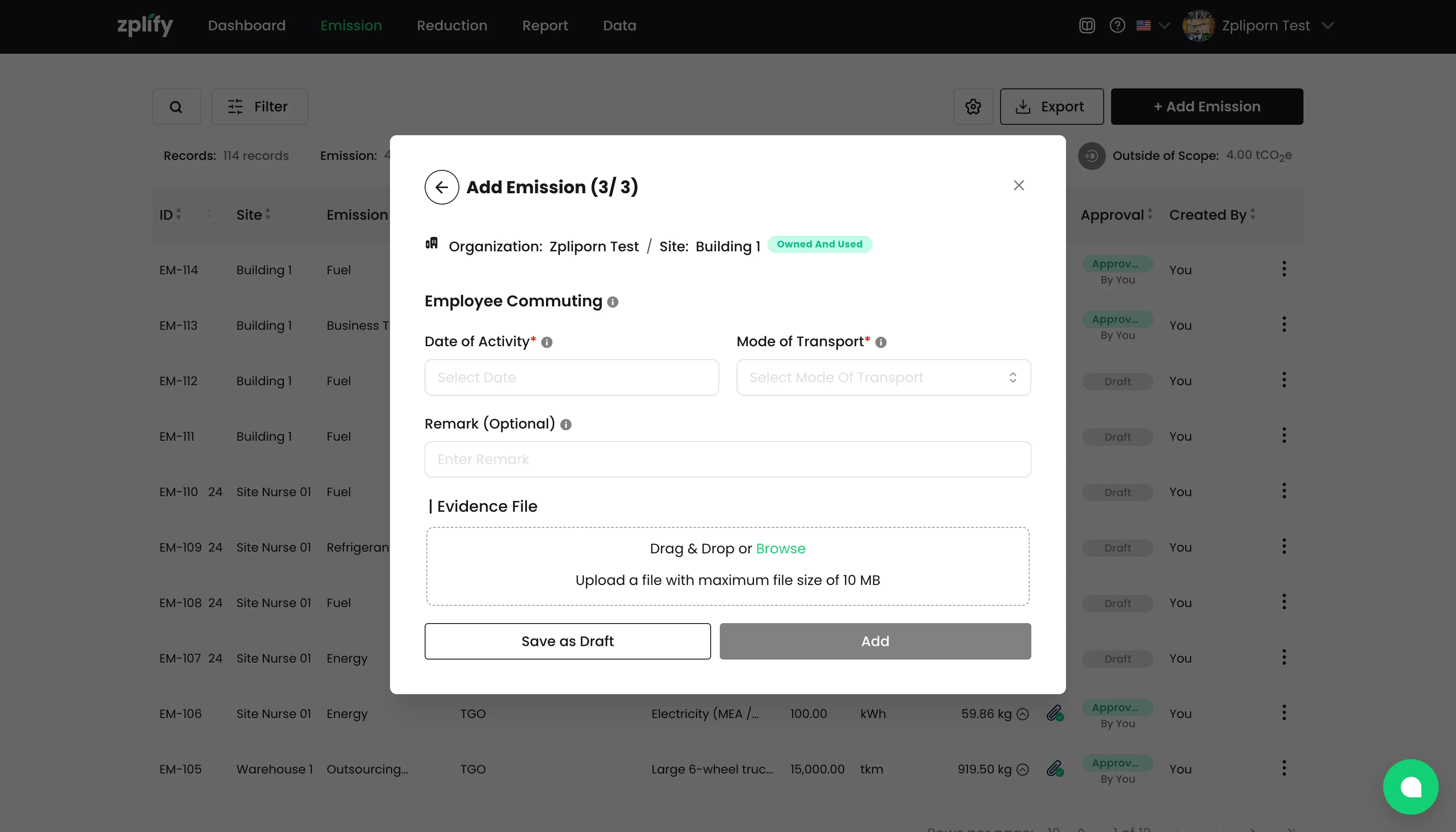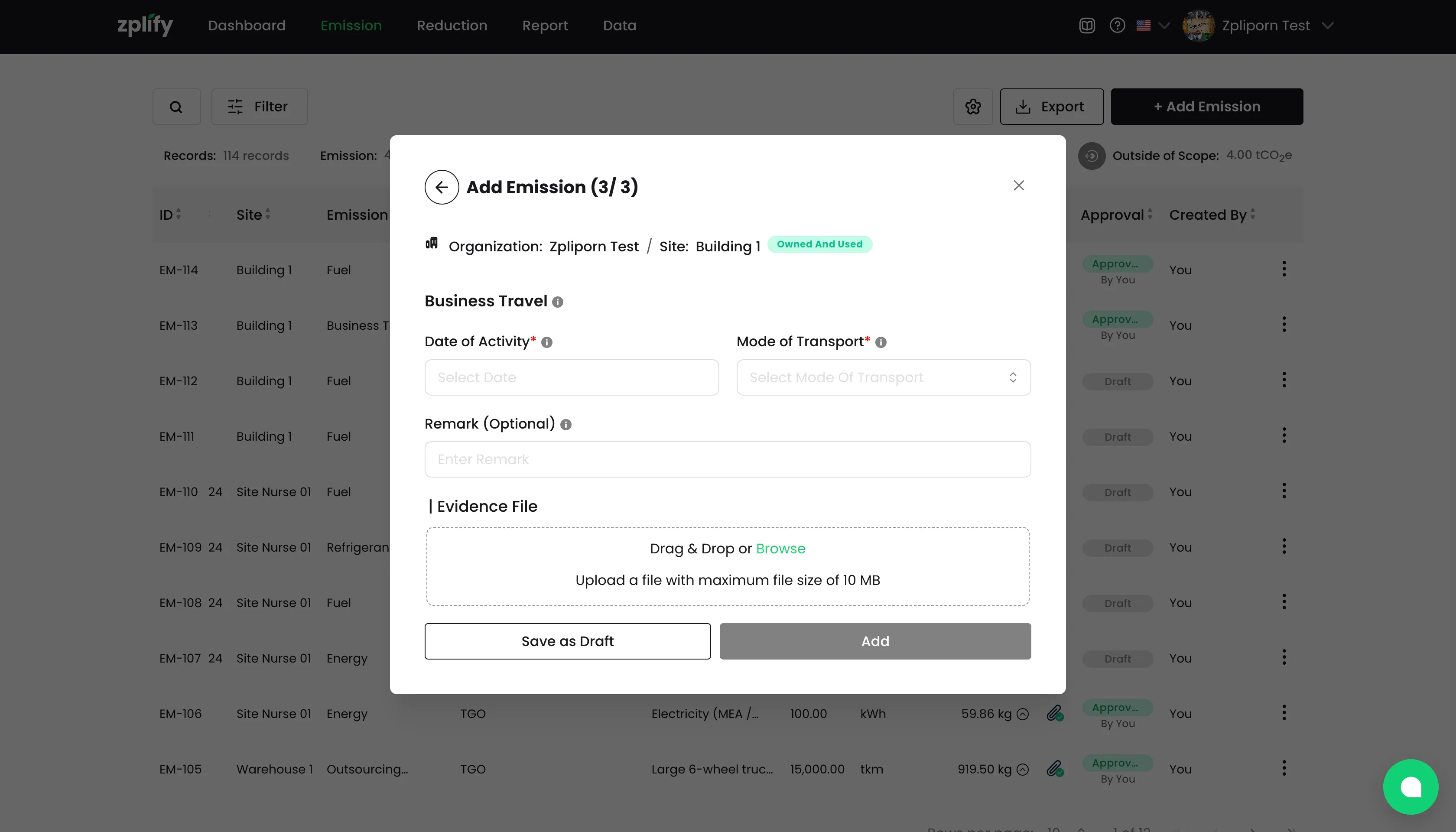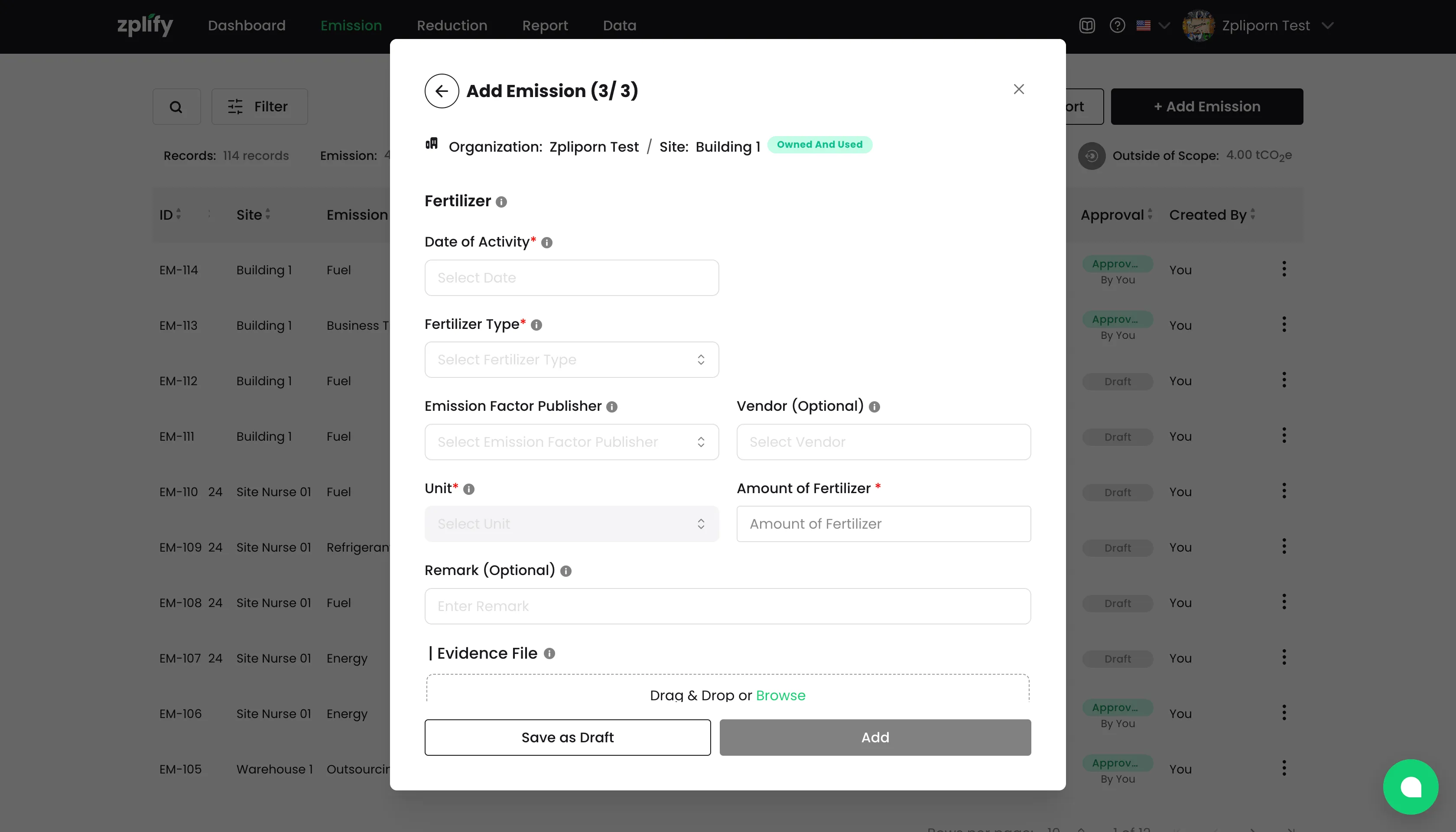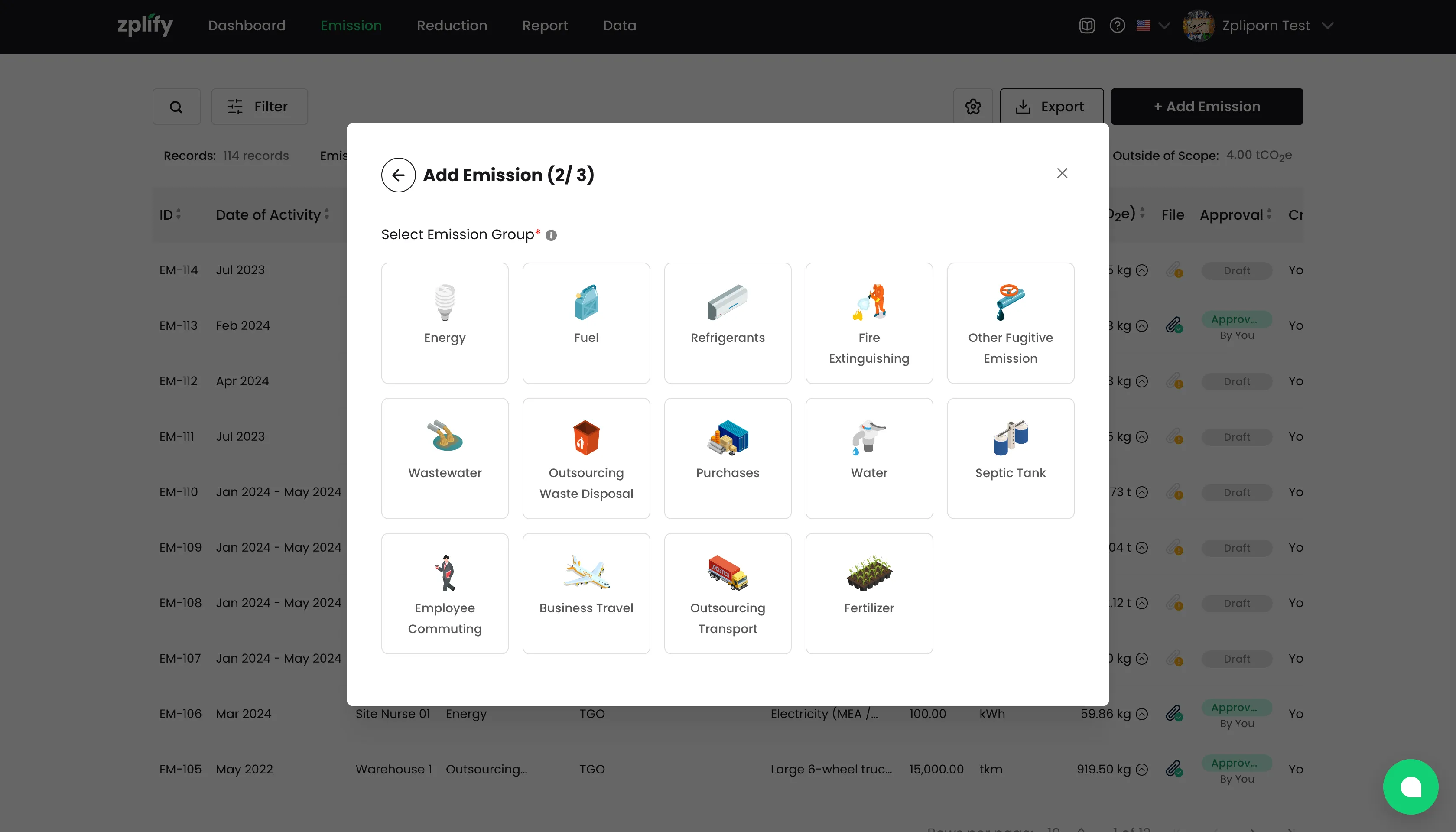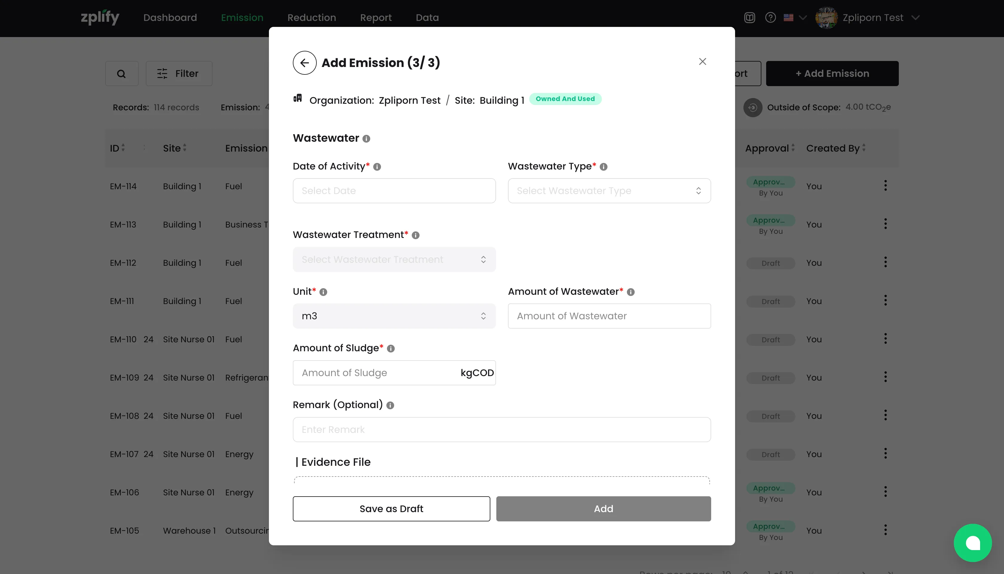 การบันทึกการปล่อย GHGs สามารถทำได้ในส่วน “กรอกข้อมูล” ซึ่งมีไว้สำหรับการนำเข้า/บันทึกข้อมูลกิจกรรมที่ก่อให้เกิดการปล่อย GHGs เข้าสู่แพลตฟอร์ม โดย Zplify จะคำนวณเป็นปริมาณการปล่อยก๊าซเรือนกระจกในที่เกิดขึ้นในแต่ละขอบเขตโดยอัตโนมัติ