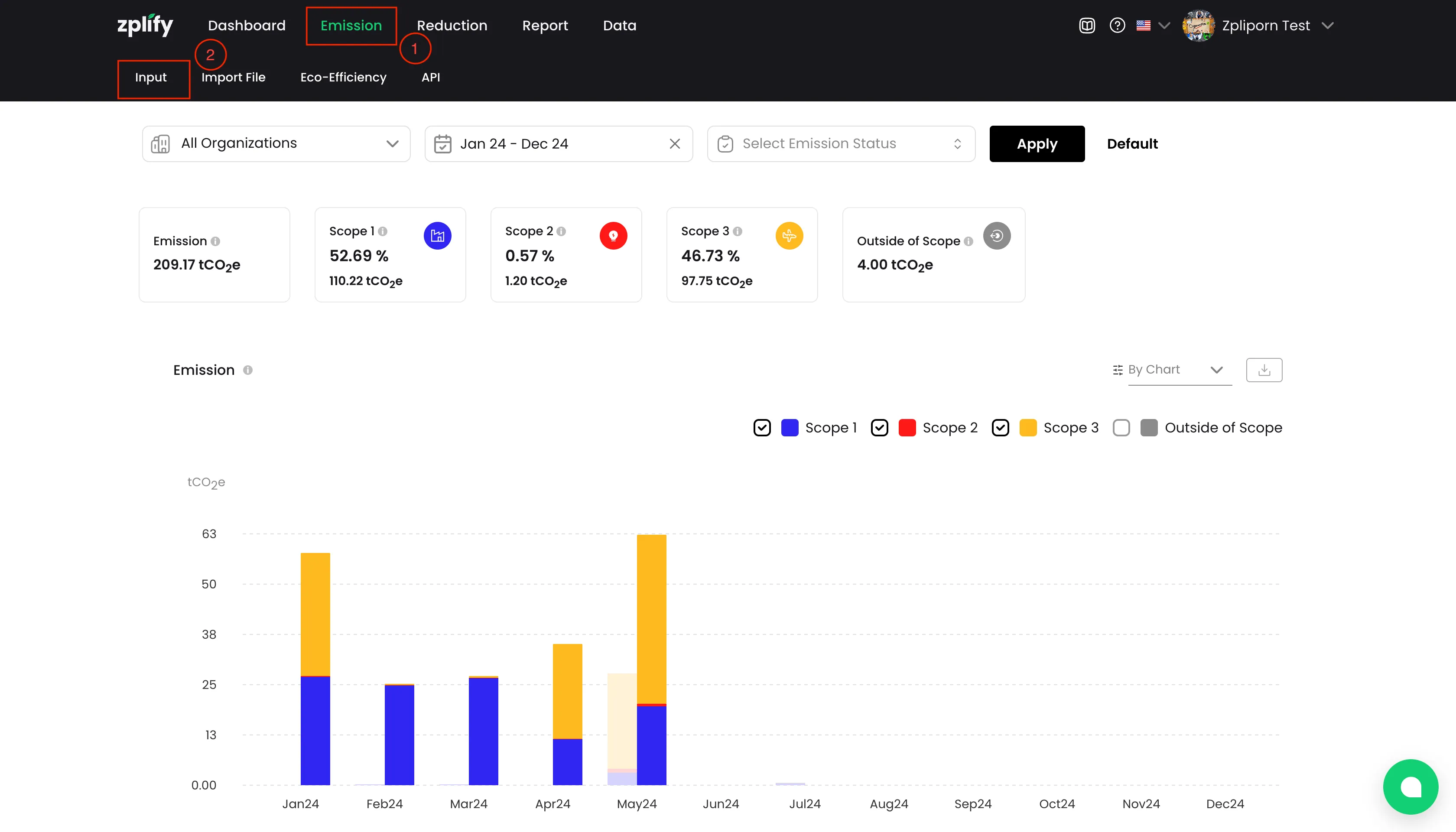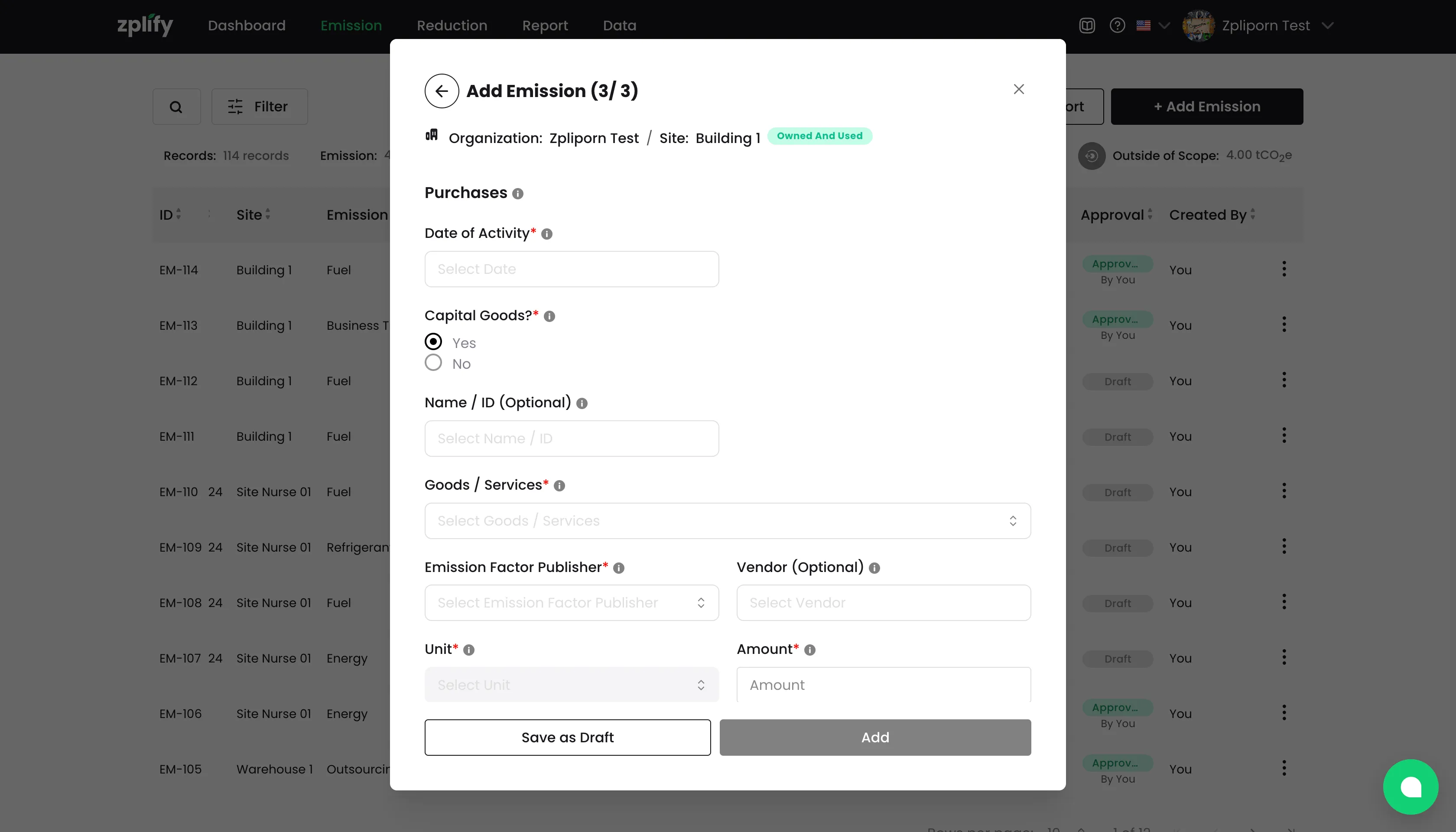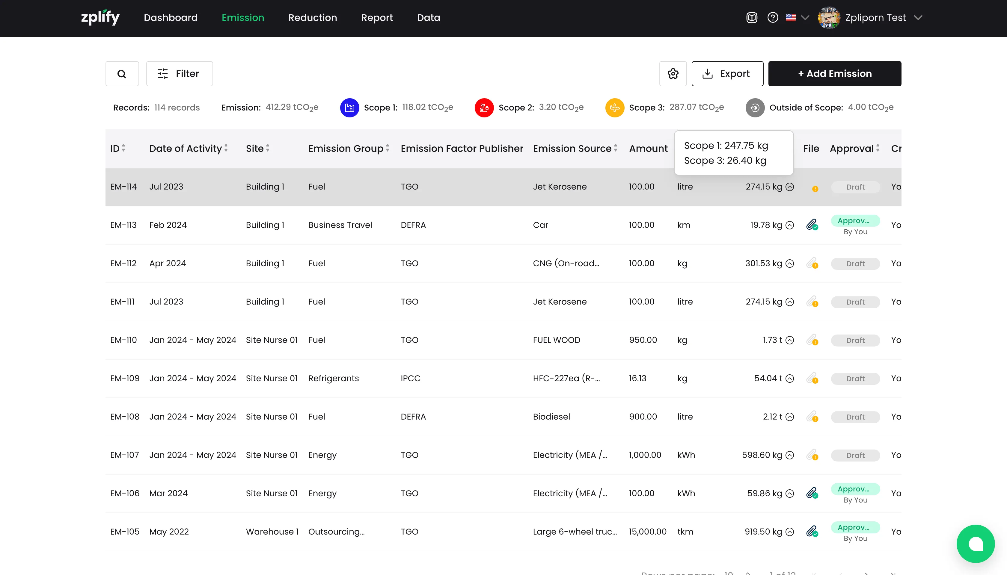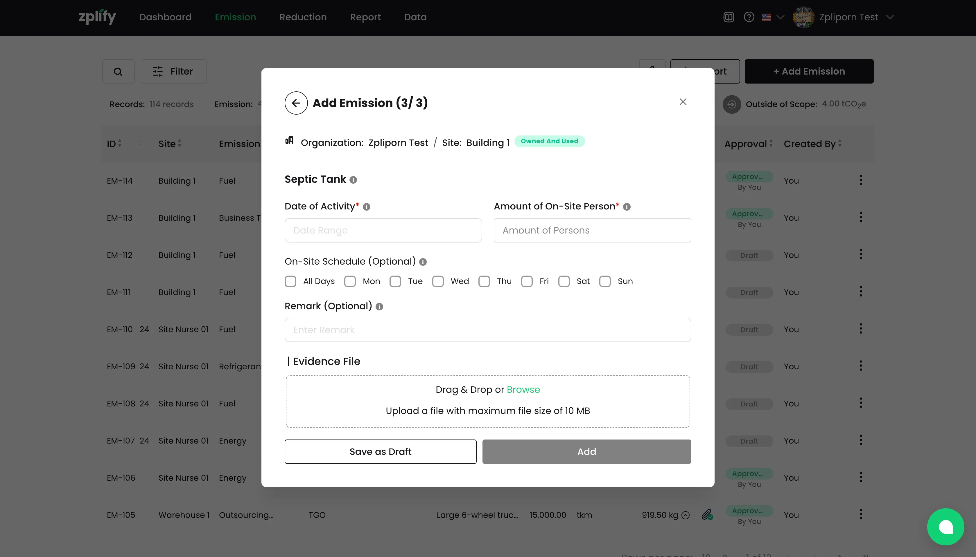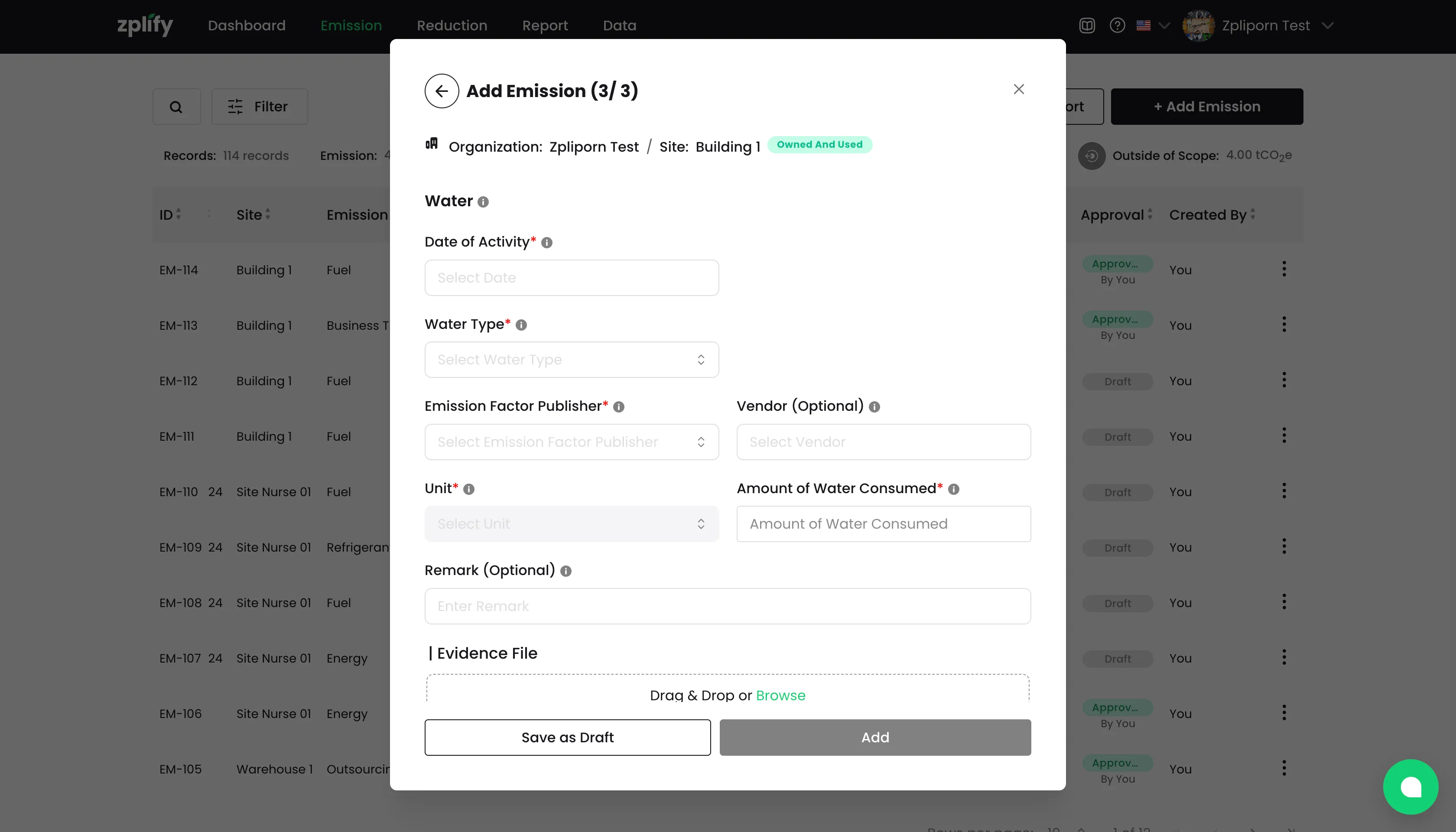 การบันทึกการปล่อย GHGs สามารถทำได้ในส่วน “กรอกข้อมูล” ซึ่งมีไว้สำหรับการนำเข้า/บันทึกข้อมูลกิจกรรมที่ก่อให้เกิดการปล่อย GHGs เข้าสู่แพลตฟอร์ม โดย Zplify จะคำนวณเป็นปริมาณการปล่อยก๊าซเรือนกระจกในที่เกิดขึ้นในแต่ละขอบเขตโดยอัตโนมัติ