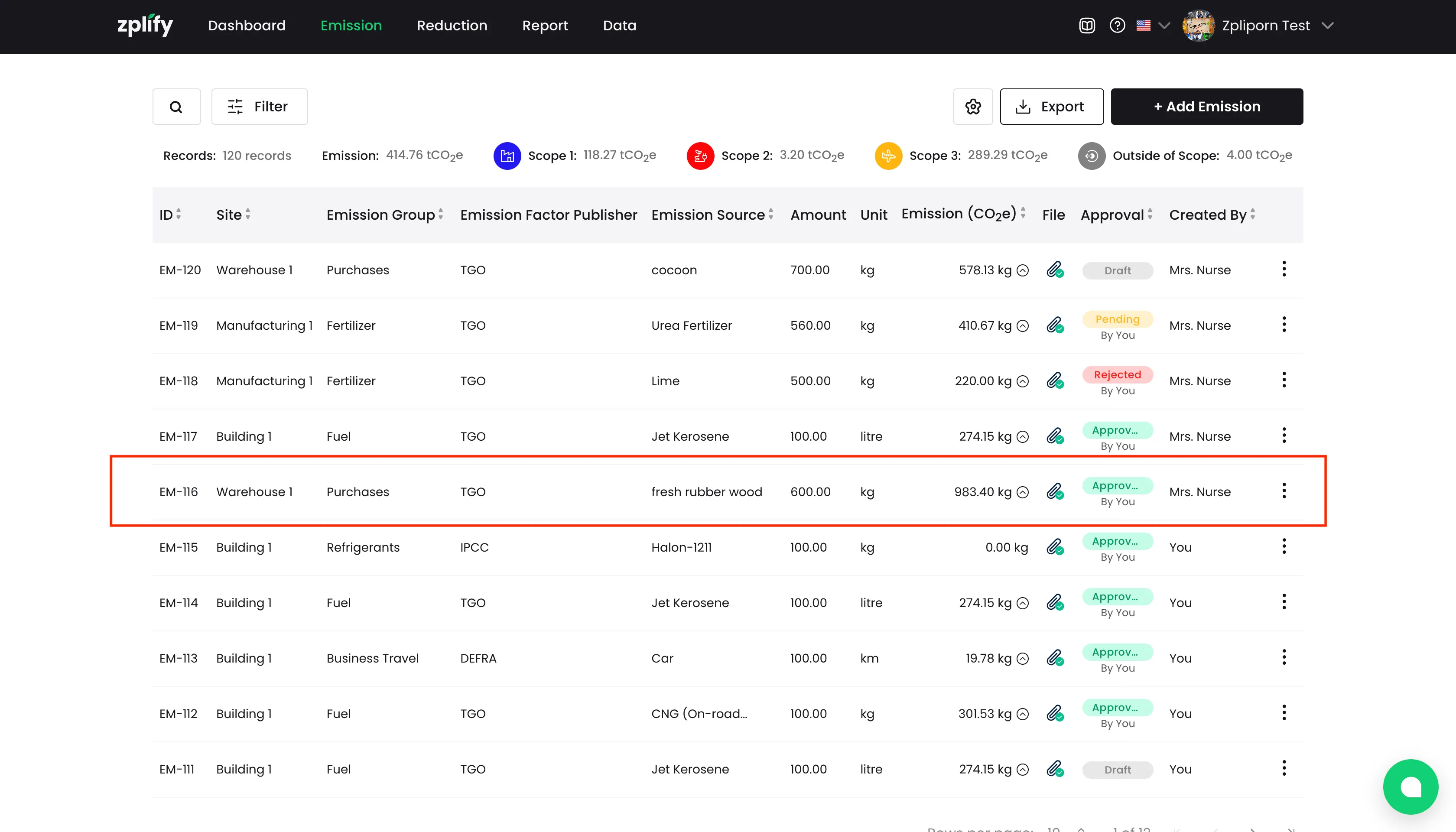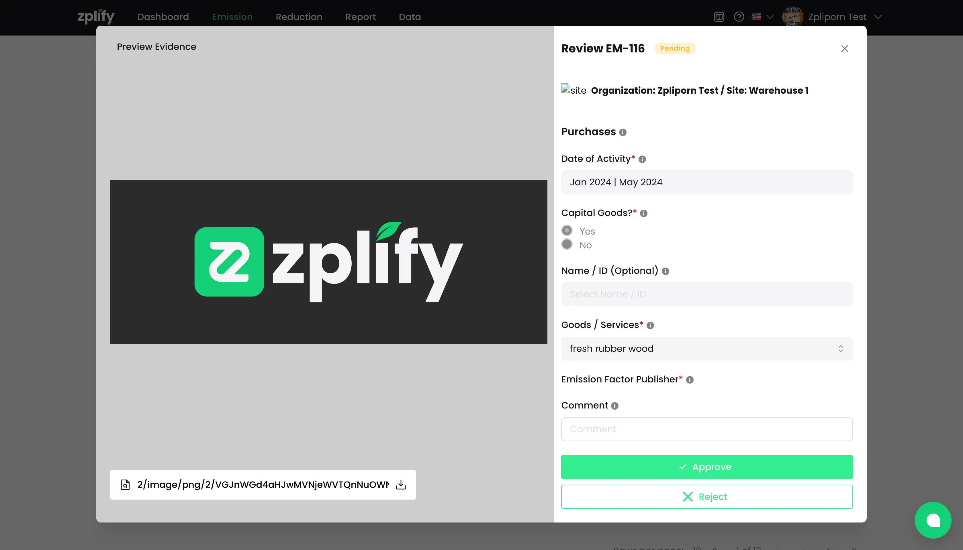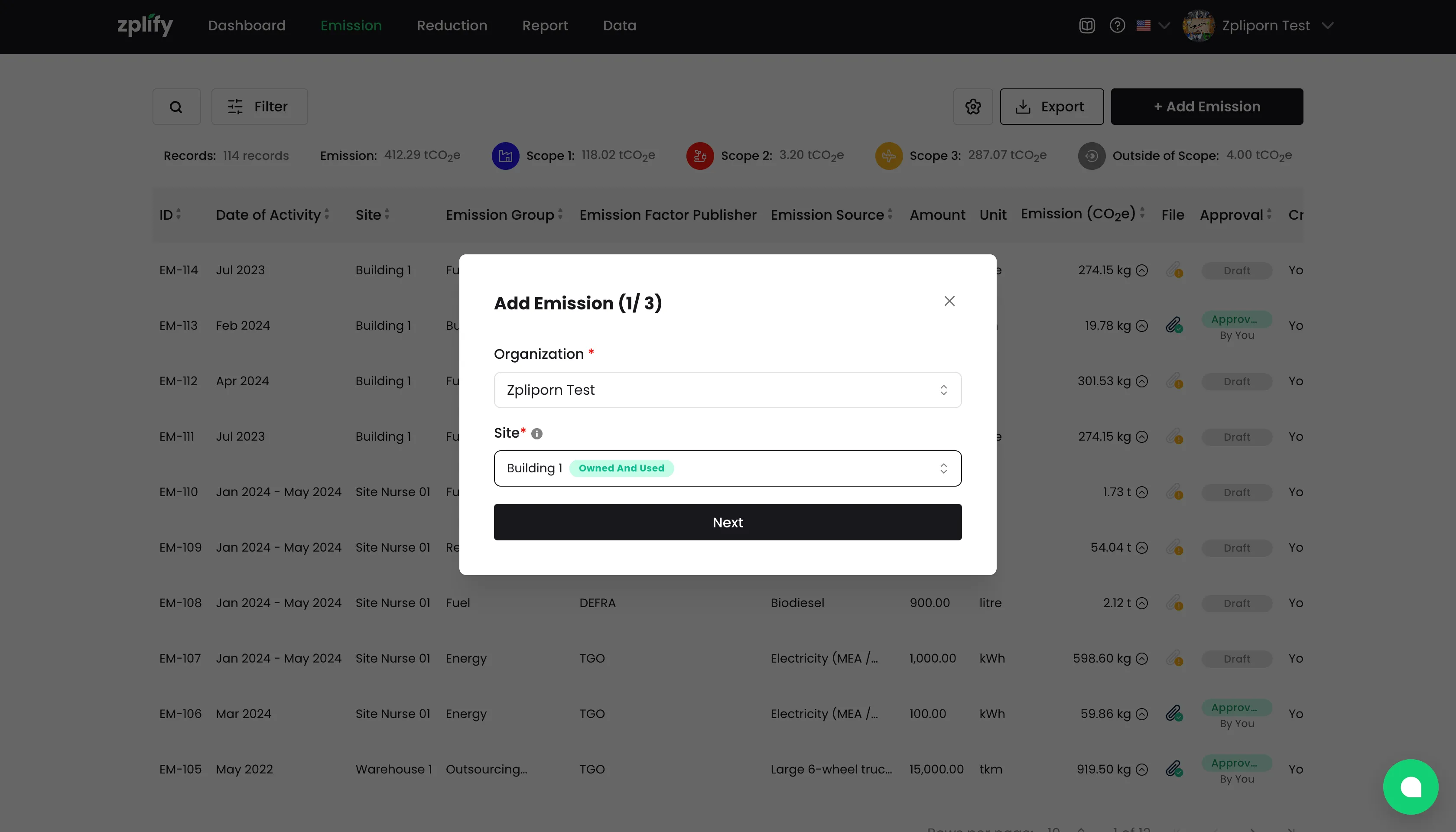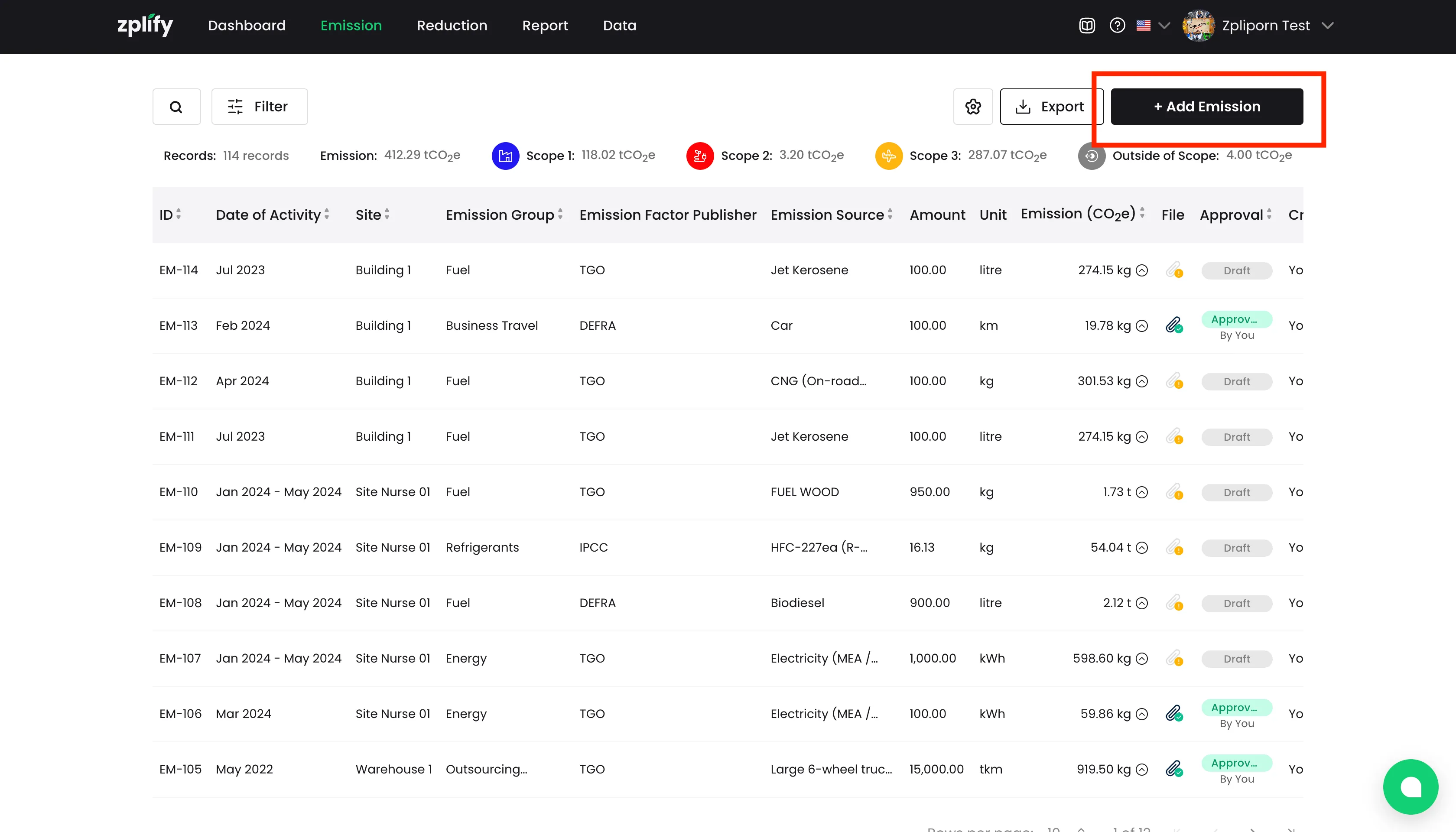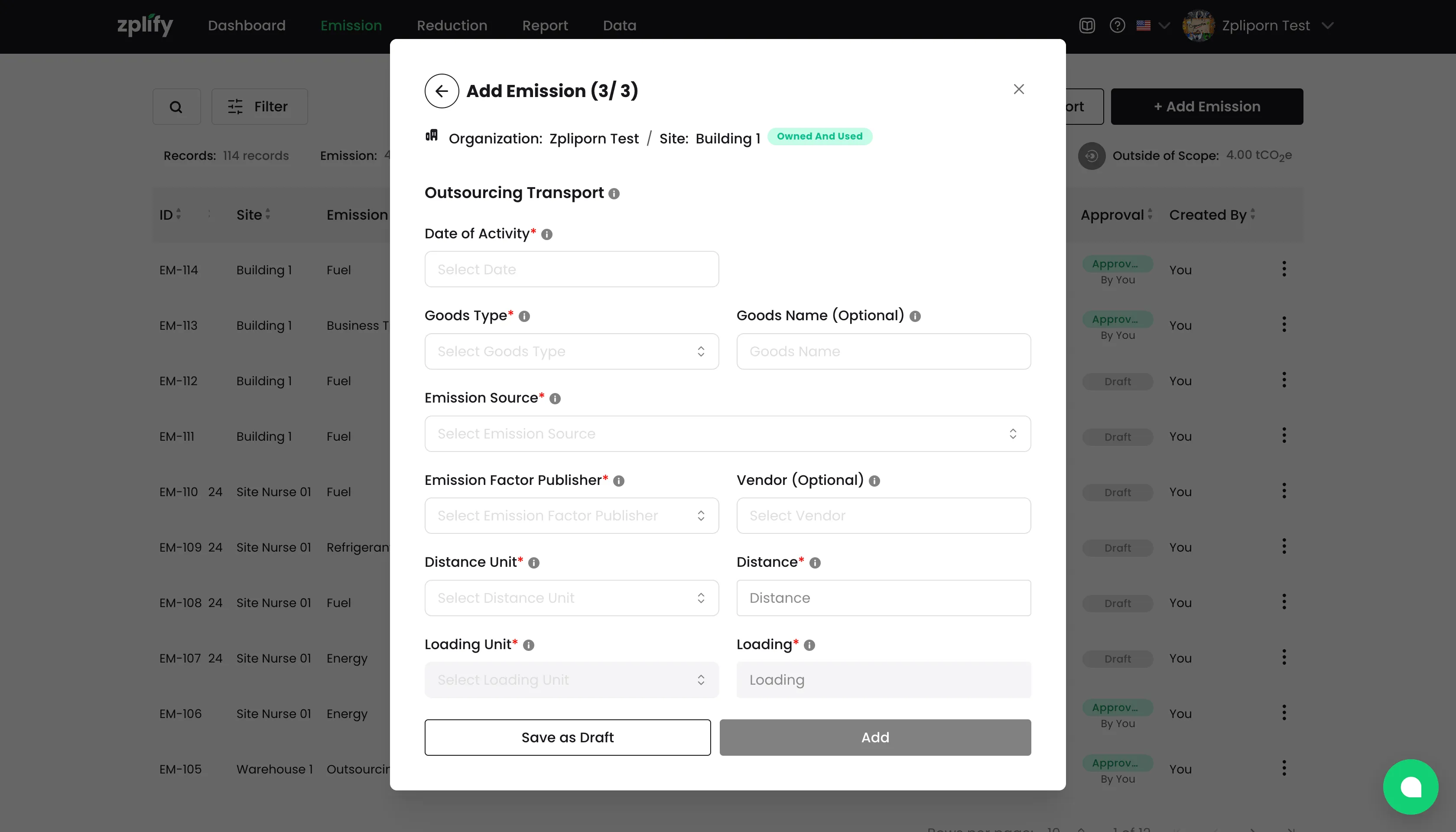 การบันทึกการปล่อย GHGs สามารถทำได้ในส่วน “กรอกข้อมูล” ซึ่งมีไว้สำหรับการนำเข้า/บันทึกข้อมูลกิจกรรมที่ก่อให้เกิดการปล่อย GHGs เข้าสู่แพลตฟอร์ม โดย Zplify จะคำนวณเป็นปริมาณการปล่อยก๊าซเรือนกระจกในที่เกิดขึ้นในแต่ละขอบเขตโดยอัตโนมัติ