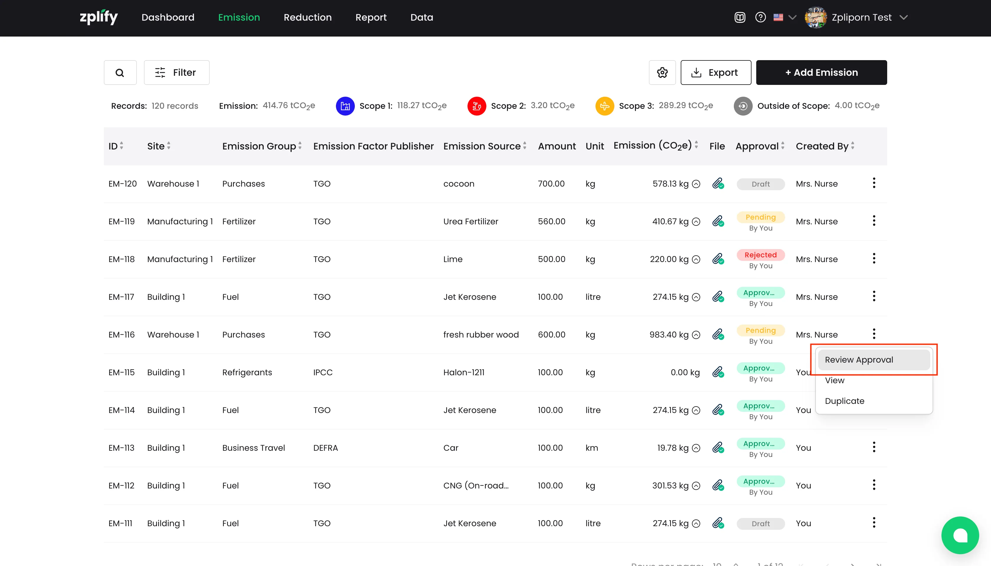 - ผู้อนุมัติ เข้ามาที่หน้าบันทึกการปล่อย GHGs จากนั้นกดปุ่มจุดสามจุดหลังรายการการปล่อย GHGs ที่ต้องการตรวจสอบ แล้วเลือก “ตรวจทานและอนุมัติ”