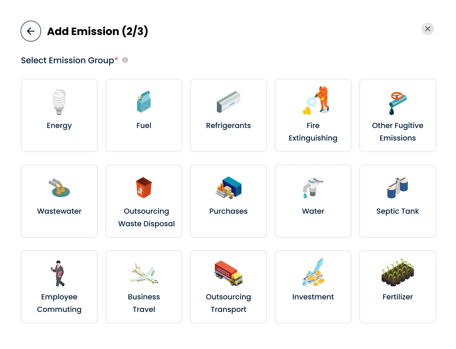 - เลือกกลุ่มการปล่อย GHGs เช่น พลังงาน, เชื้อเพลิง, สารทำความเย็น, สารดับเพลิง, การรั่วไหลอื่นๆ, น้ำเสีย, และบ่อเกรอะ เป็นต้น