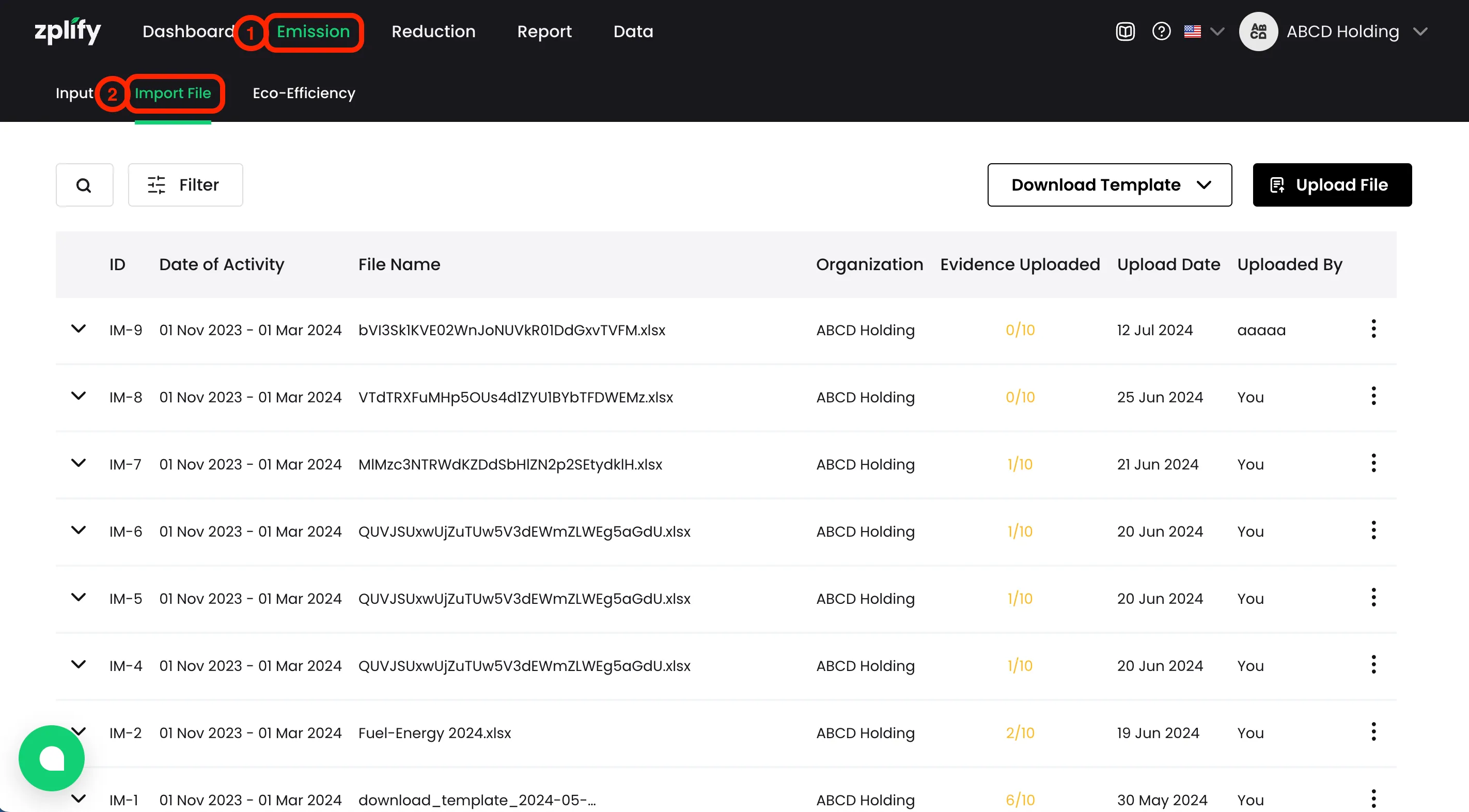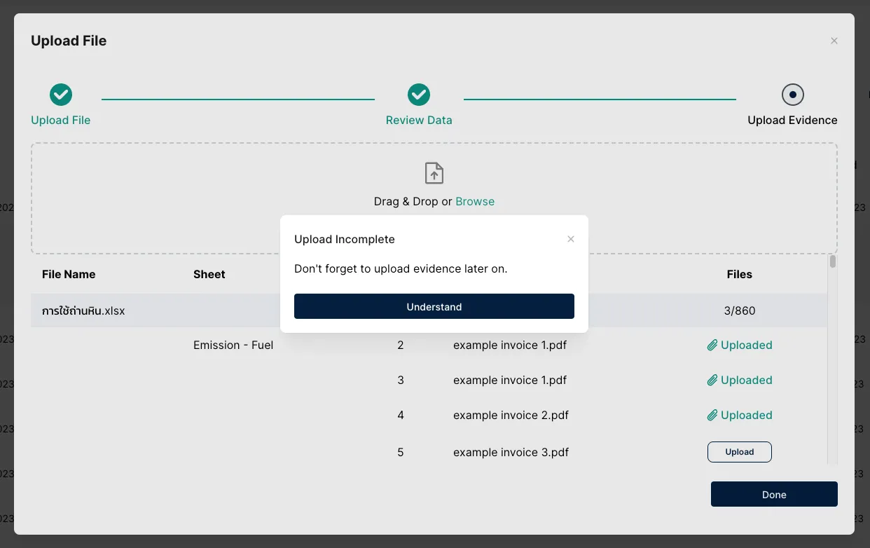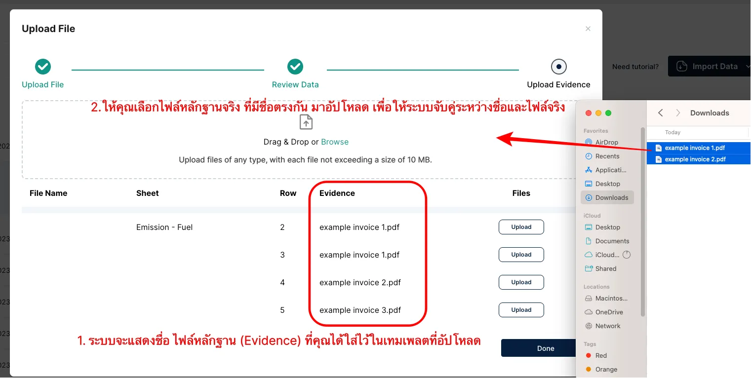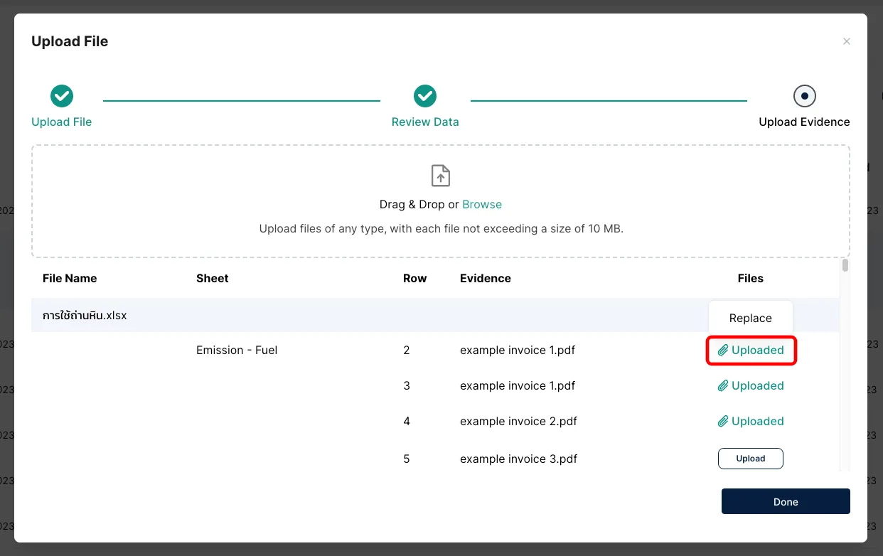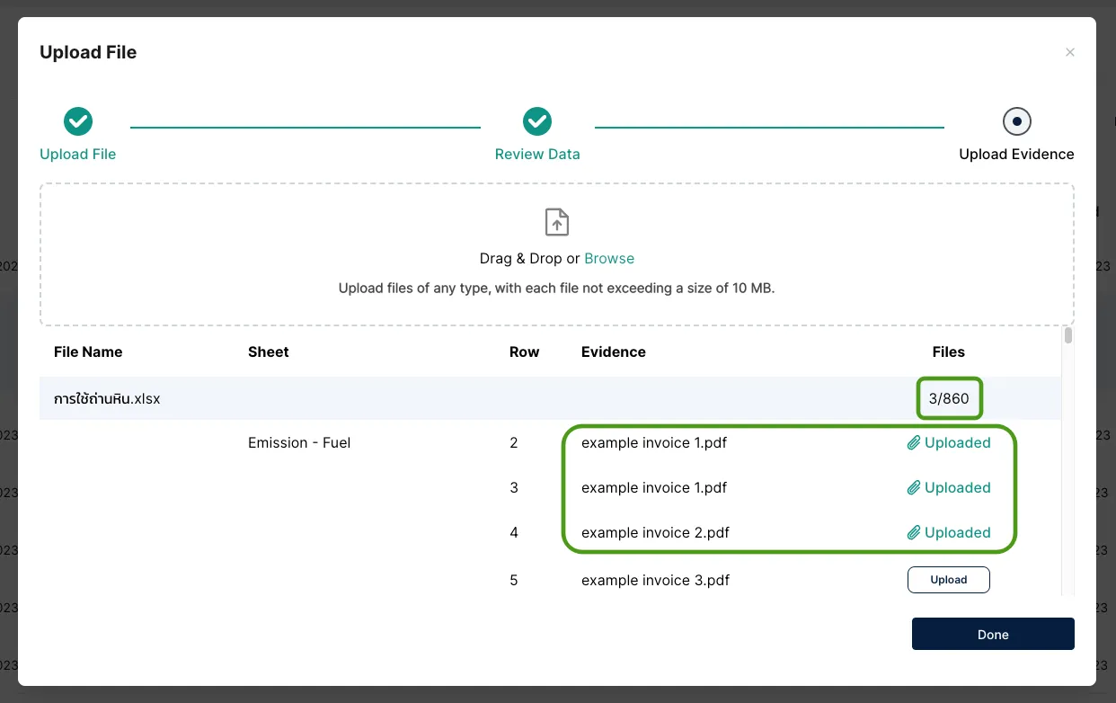 หากคุณได้ใส่ชื่อ ไฟล์หลักฐาน ที่สัมพันธ์กับรายการการปล่อย GHGs ไว้ในเทมเพลต คุณจะได้เห็นชื่อไฟล์เหล่านั้นปรากฏในขั้นตอน อัปโหลดหลักฐาน (Upload Evidence)