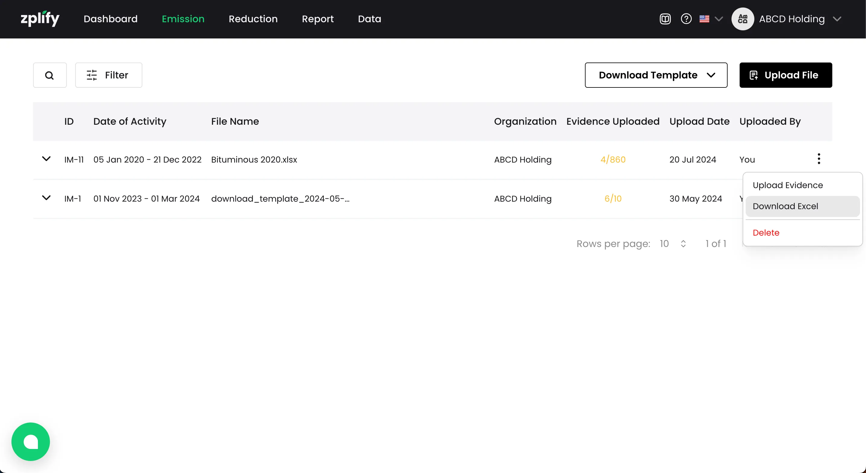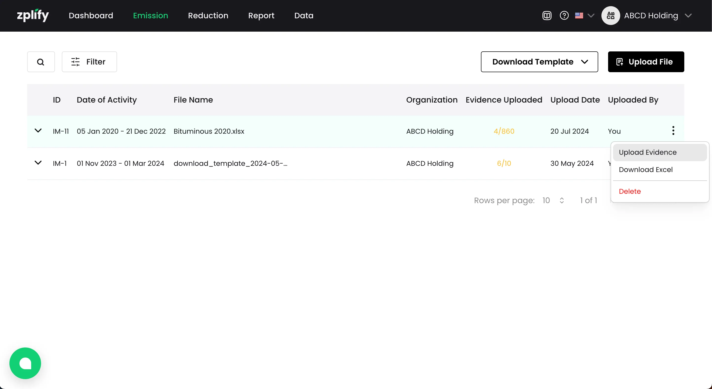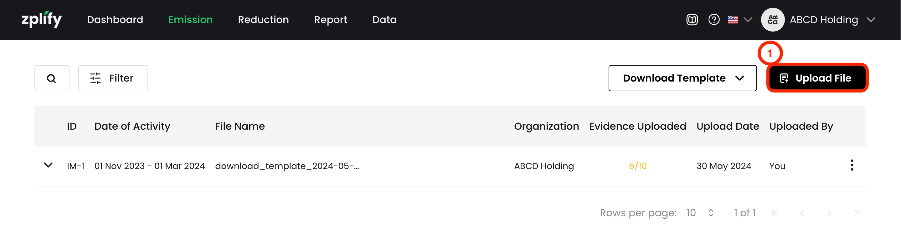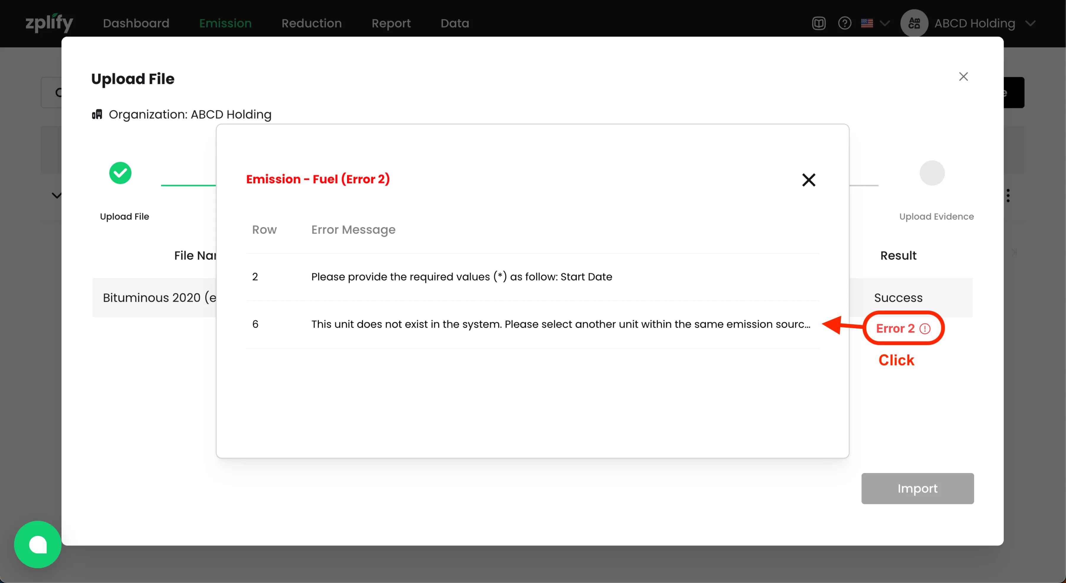หากคุณได้ใส่ชื่อ ไฟล์หลักฐาน ที่สัมพันธ์กับรายการการปล่อย GHGs ไว้ในเทมเพลต คุณจะได้เห็นชื่อไฟล์เหล่านั้นปรากฏในขั้นตอน อัปโหลดหลักฐาน (Upload Evidence)
