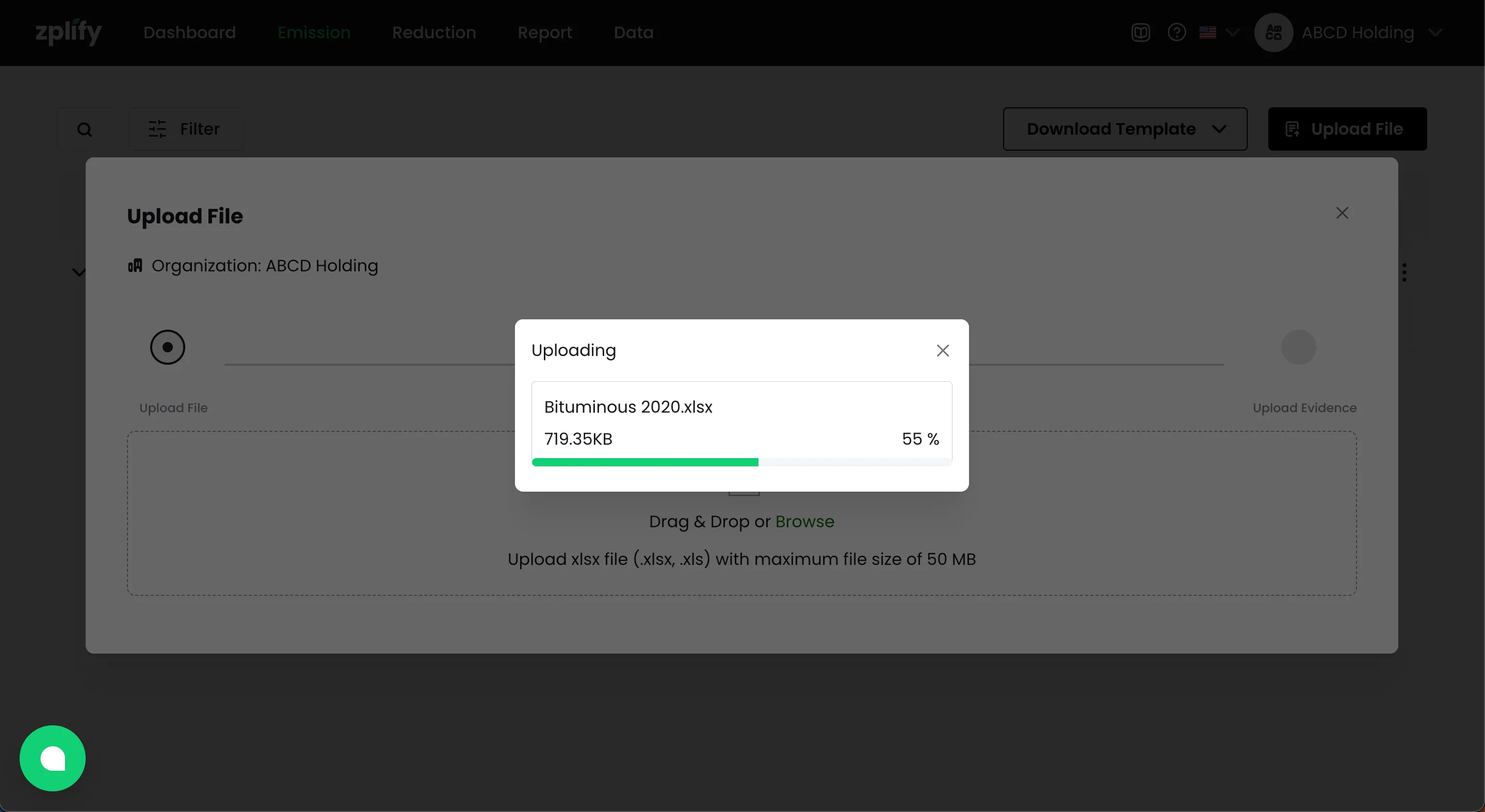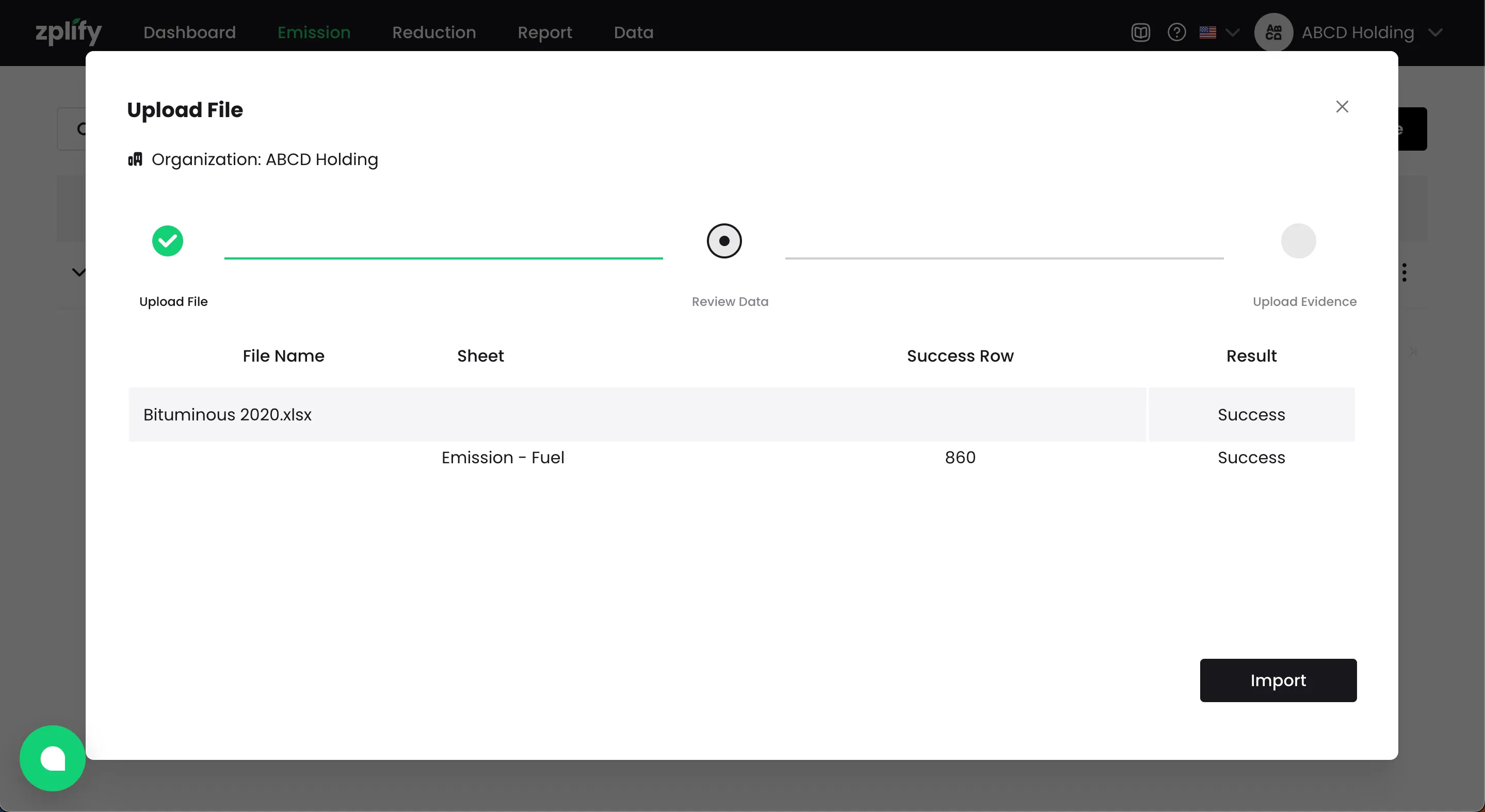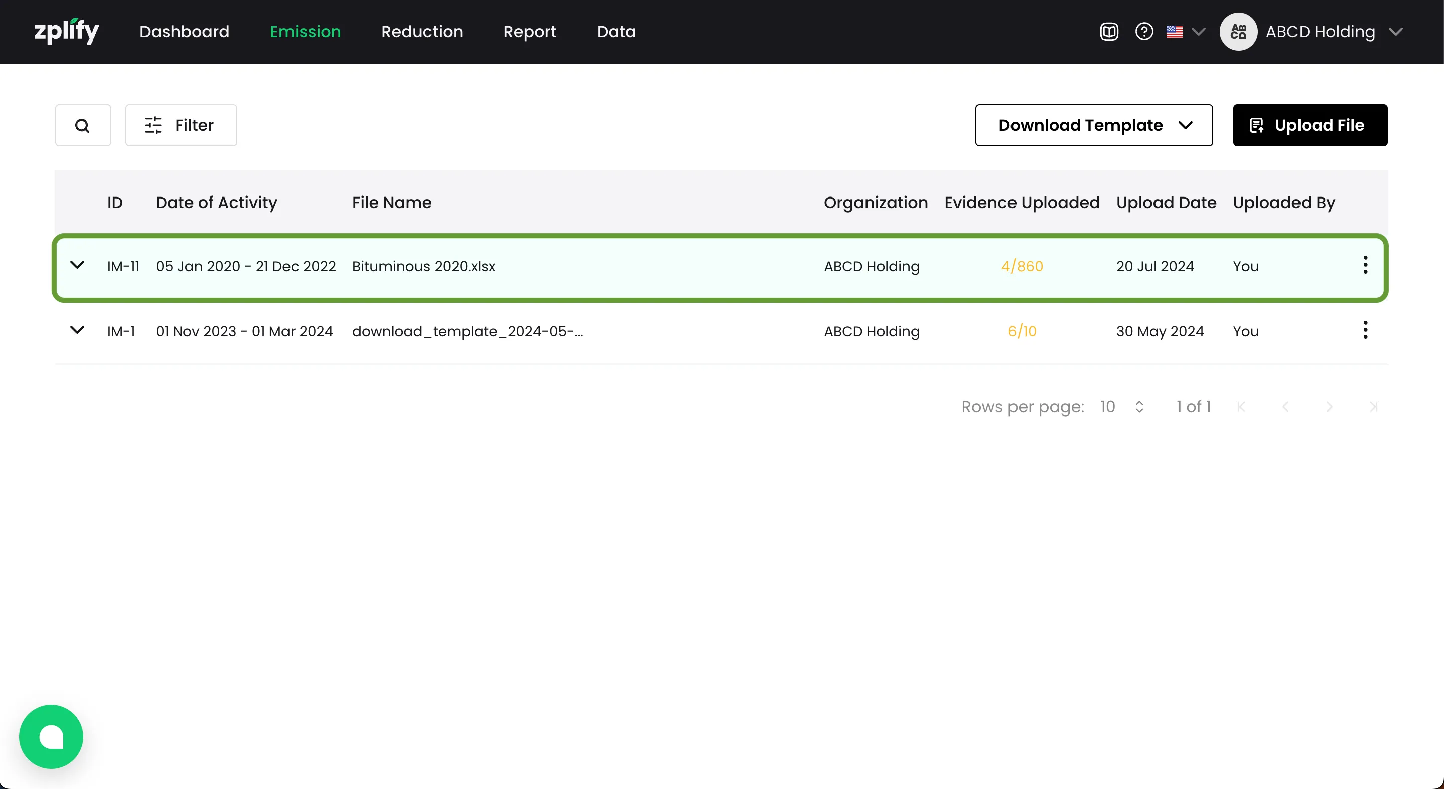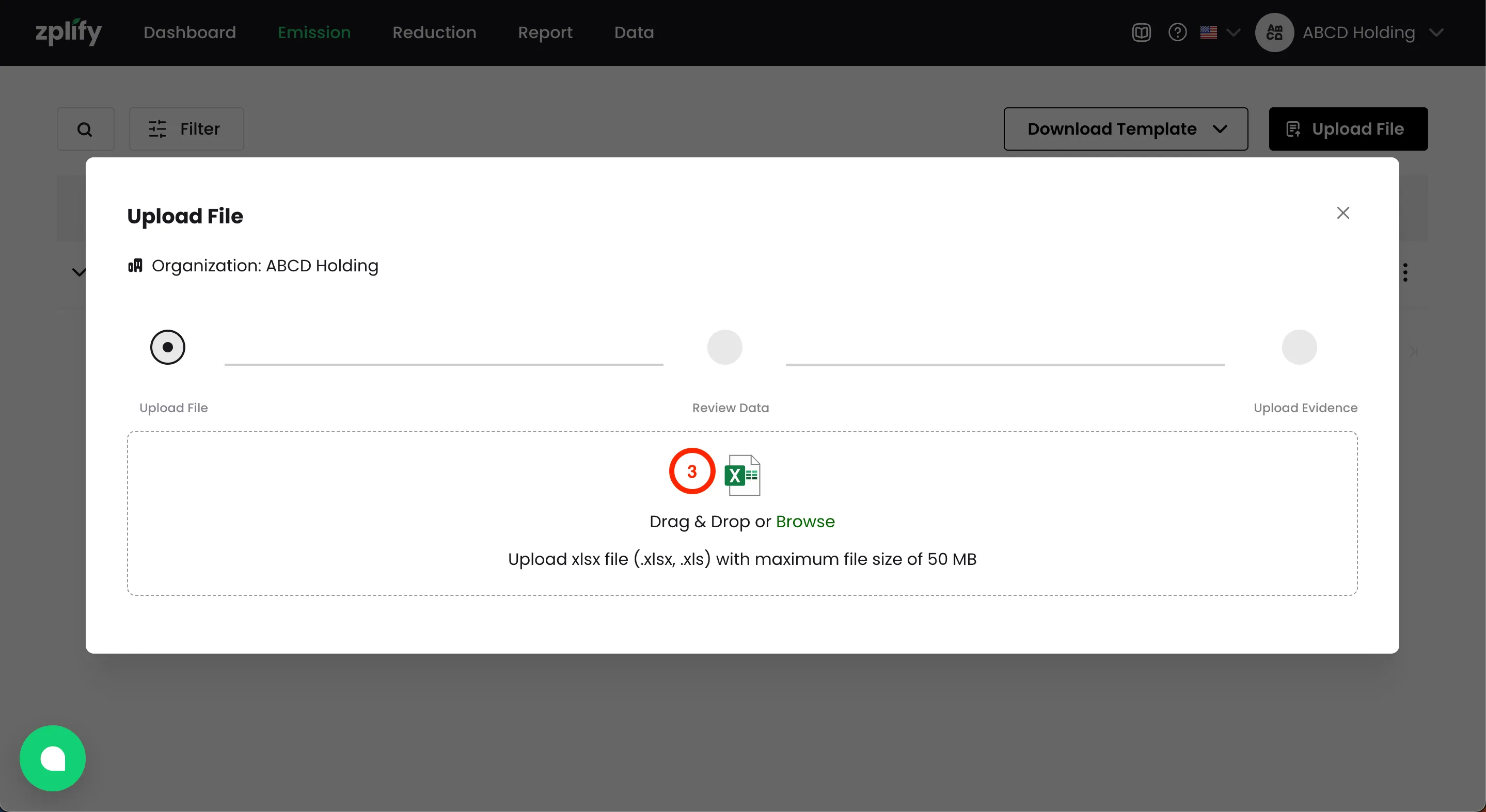 หากคุณได้ใส่ชื่อ ไฟล์หลักฐาน ที่สัมพันธ์กับรายการการปล่อย GHGs ไว้ในเทมเพลต คุณจะได้เห็นชื่อไฟล์เหล่านั้นปรากฏในขั้นตอน อัปโหลดหลักฐาน (Upload Evidence)