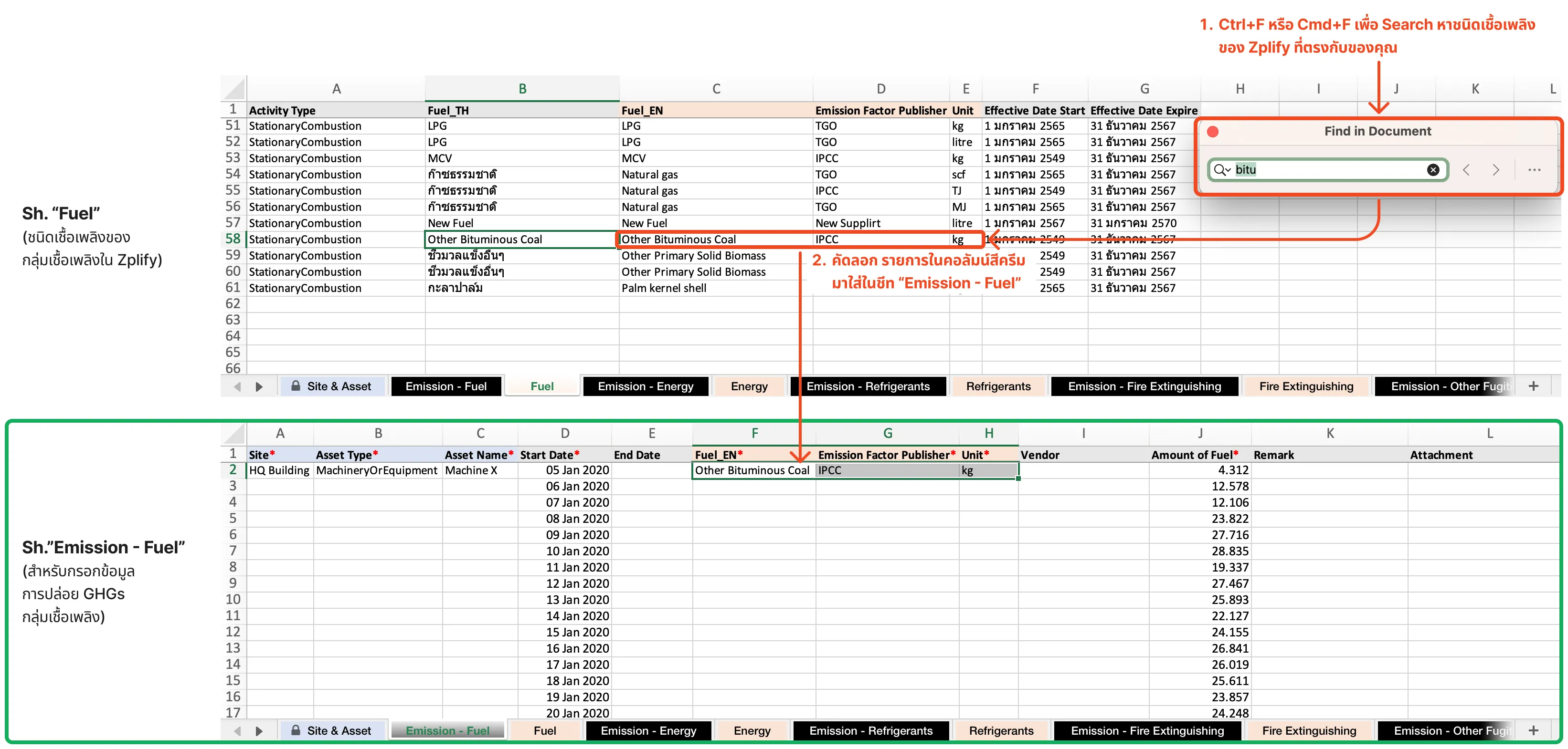 - คุณยังเหลือข้อมูลอีก 2 คอลัมน์ที่ยังต้องกรอก คือ “Fuel_EN” และ “Unit” ให้ดูเทมเพลตชีท “Fuel” เพื่อหาชนิดเชื้อเพลิงของ Zplify ที่ตรงกับชื่อเชื้อเพลิงที่คุณเก็บในระบบ จากไฟล์ข้อมูลดิบตัวอย่าง มีการใช้ชื่อว่า “Bituminous size 10-25 mm.” แต่ในระบบของ Zplify คือ “Other Bituminous Coal” ให้คัดลอกและวางตามขั้นตอนในรูป
