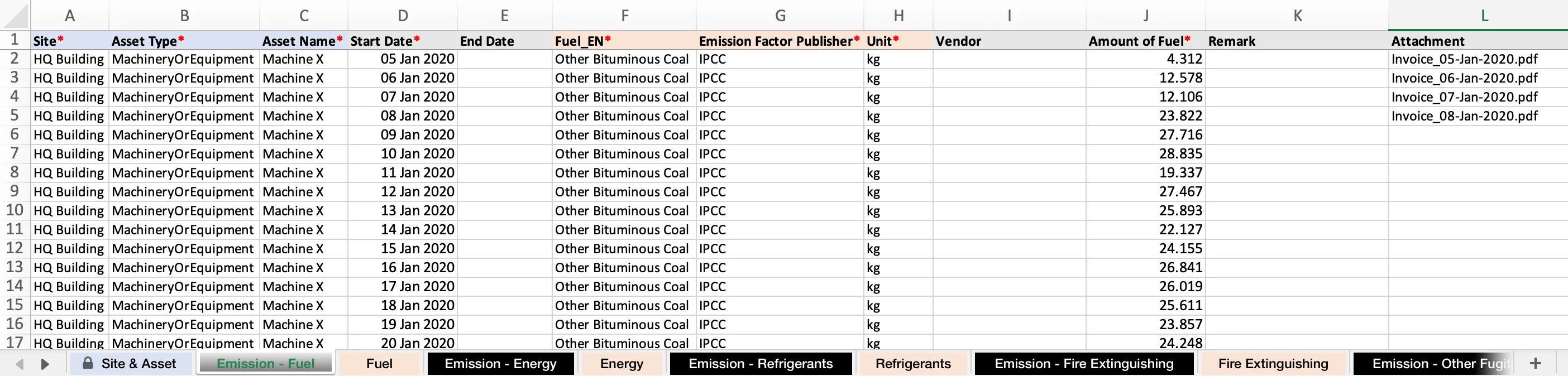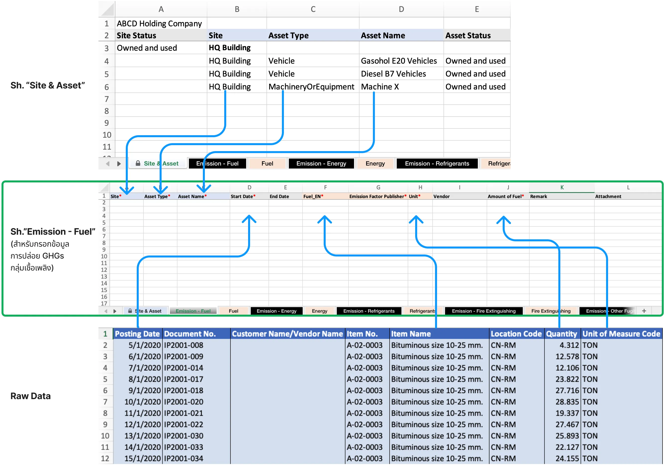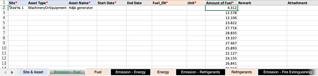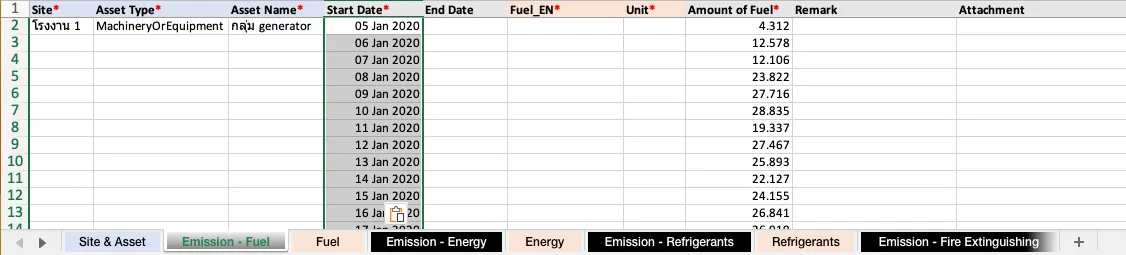 - คัดลอก ไซต์และสินทรัพย์ จากเทมเพลตในชีท “Site & Asset” และคัดลอก ปริมาณเชื้อเพลิง จากไฟล์ข้อมูลดิบ มาวางในคอลัมน์ที่สัมพันธ์กันในชีท “Emission - Fuel” ซึ่งเป็นชีทที่คุณต้องกรอกข้อมูลการปล่อย GHGs จากกิจกรรมการใช้เชื้อเพลิงนี้