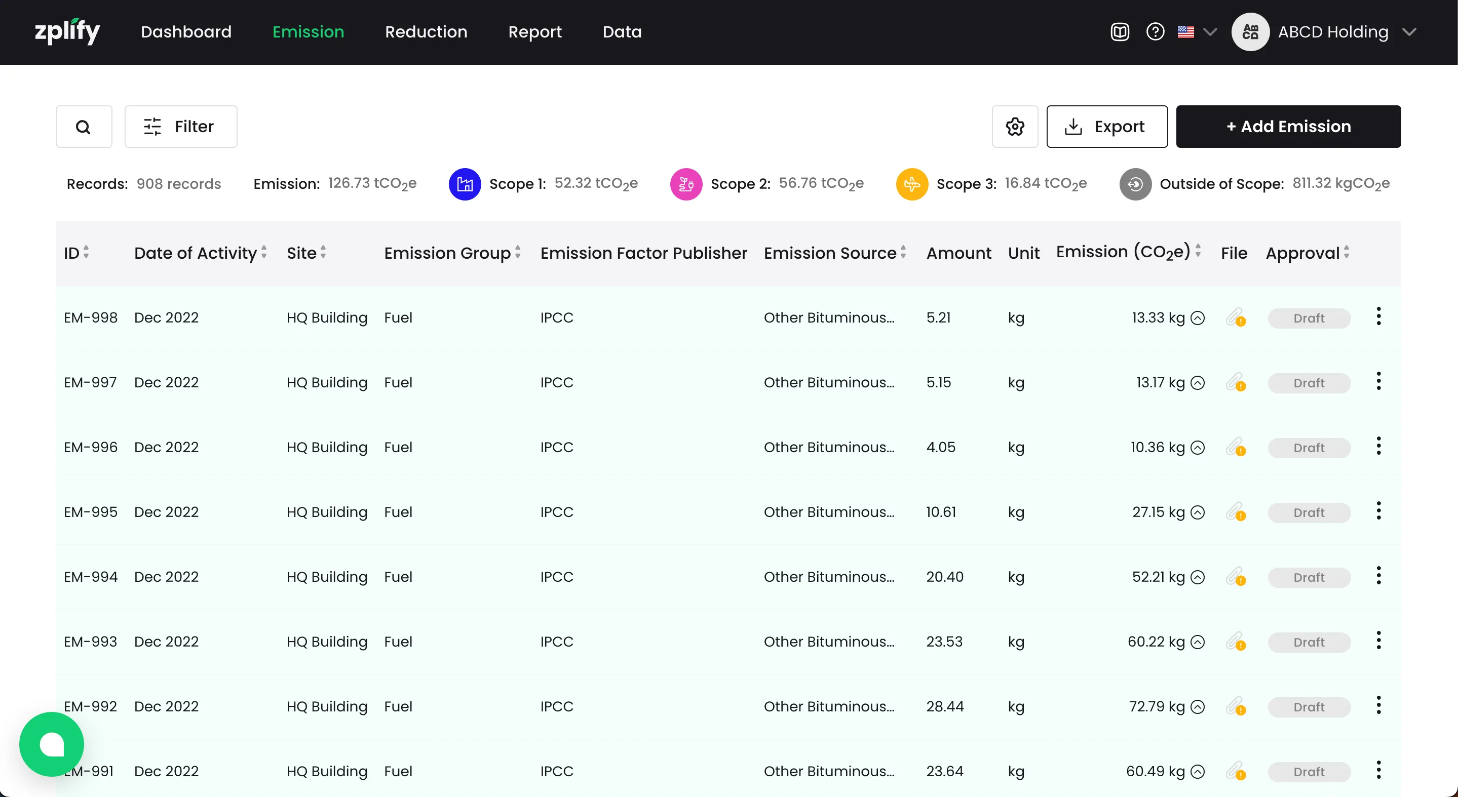 Emission ชื่อชีทขึ้นต้นด้วย “Emission” จะเป็นชีทที่คุณต้องกรอกข้อมูลการปล่อย GHGs โดยแต่ละชีทจะแบ่งตามกลุ่มการปล่อย เช่นเดียวกับการกรอกข้อมูลผ่านหน้าจอ Zplify ได้แก่