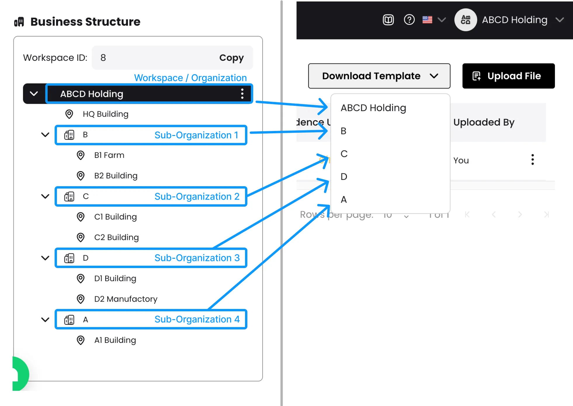 ABCD Holdingไว้ตามภาพซ้ายมือ จึงปรากฎรายชื่อ องค์กร (Organization) ที่สามารถดาวน์โหลดเทมเพลตได้ ตามภาพขวามือ