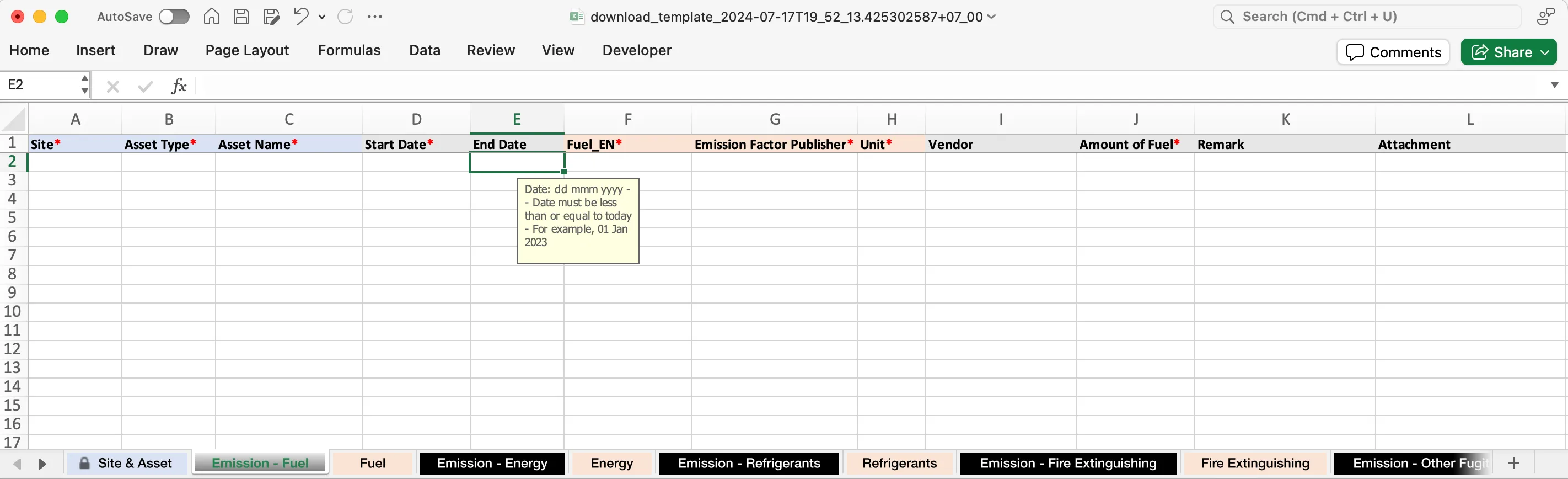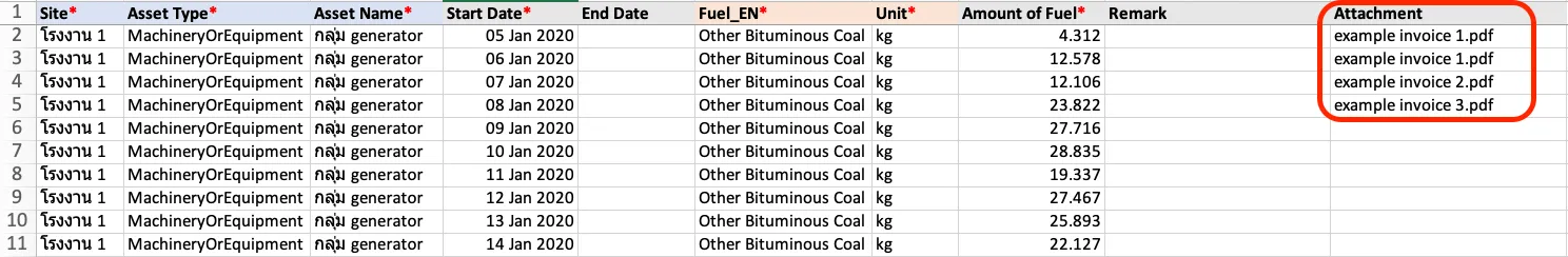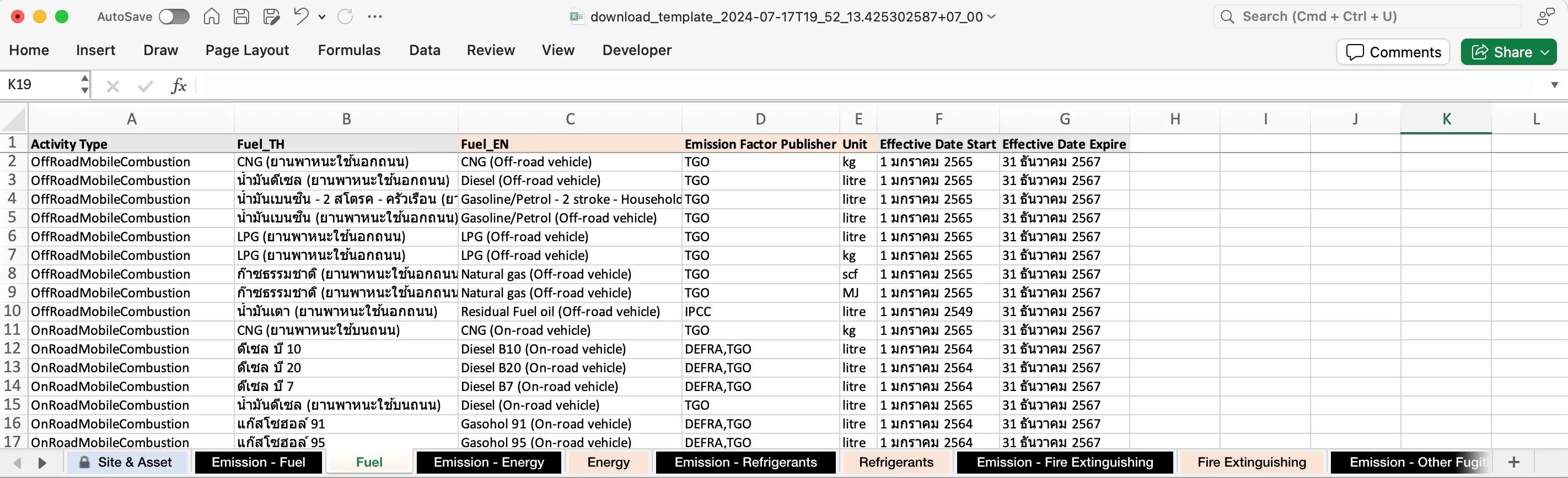 - ตรวจดูเทมเพลตในชีท “Emission - Fuel” ว่าระบบต้องการค่าใดบ้าง และไฟล์ข้อมูลดิบ (Raw Data) ของคุณมีค่าดังกล่าวครบถ้วนหรือไม่