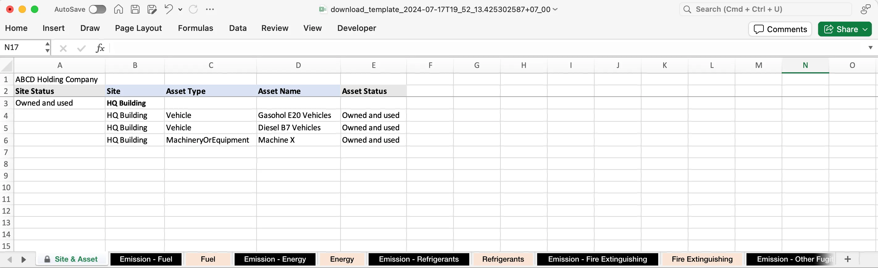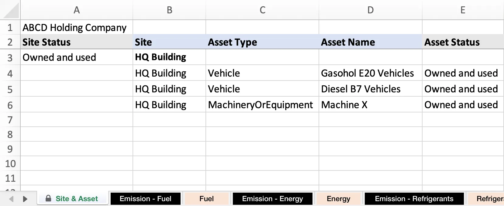 Site & Asset ระบุข้อมูลไซต์และสินทรัพย์ขององค์กรที่คุณเลือก ซึ่งคุณจะนำไปใช้ในการกรอกข้อมูลการปล่อย GHGs ในแต่ละชีท Emission